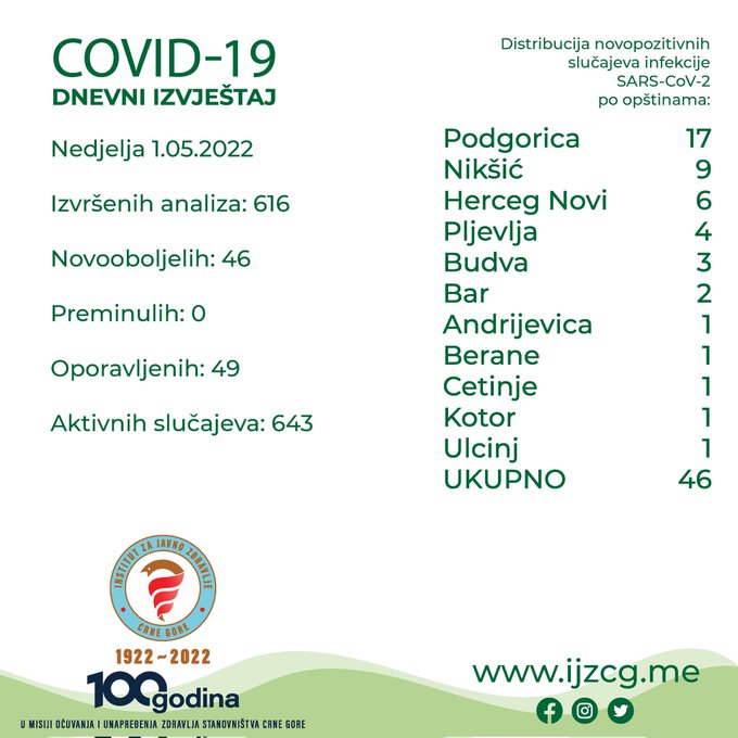 U Crnoj Gori od posljedica infekcije korona virusom u posljednja 24 sata nije bilo preminulih osoba, a registrovana su još 46 novooboljela, saopšteno je iz Instituta za javno zdravlje.
