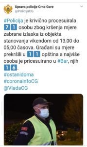 Policija je krivično procesuirala 71 osobu zbog kršenja mjere zabrane izlaska iz objekta stanovanja vikendom od 13 do pet časova, objavljeno je na Tviter nalogu Uprave policije.