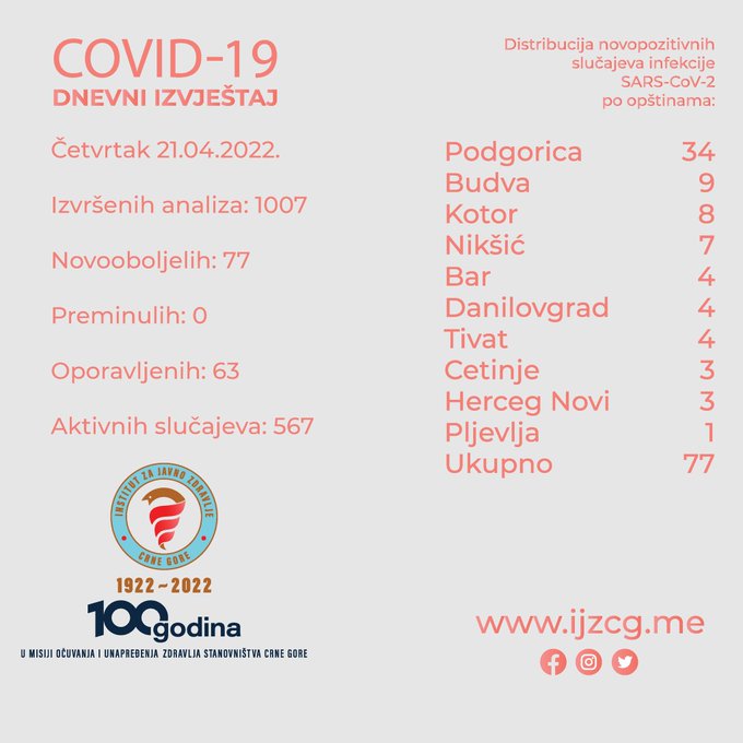 U posljednja 24 sata u Crnoj Gori registrovano je 77 novih slučajeva koronavirusa, saopšteno je iz Instituta za javno zdravlje IJZ.