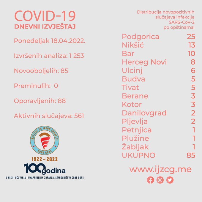 Laboratorije Instituta za javno zdravlje Crne Gore (IJZCG), druge javne i privatne laboratorije koje se bave dijagnostikom infekcije novog koronavirusa su tokom jučerašnjeg dana (ponedjeljak, 18. 04. 2022. godine) završile analizu i IJZCG dostavile rezultate za 1.253 uzorka na novi koronavirus.