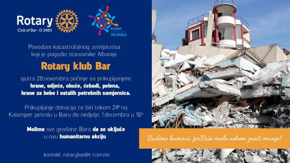 Stanovništvu Albanskih gradova pogođenih zemljotresom Rotary klub Bar je pokrenuo je akciju prikupljanja pomoći, piše Analitika.