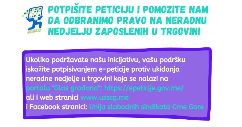 Predsjednica Unije slobodnih sindikata Vesna Milonjić Aleksić, je pozvala građane da potpišu e-peticiju koja se nalazi na portalu Glas građana sa ciljem da odbrane pravo na neradnu nedjelju.