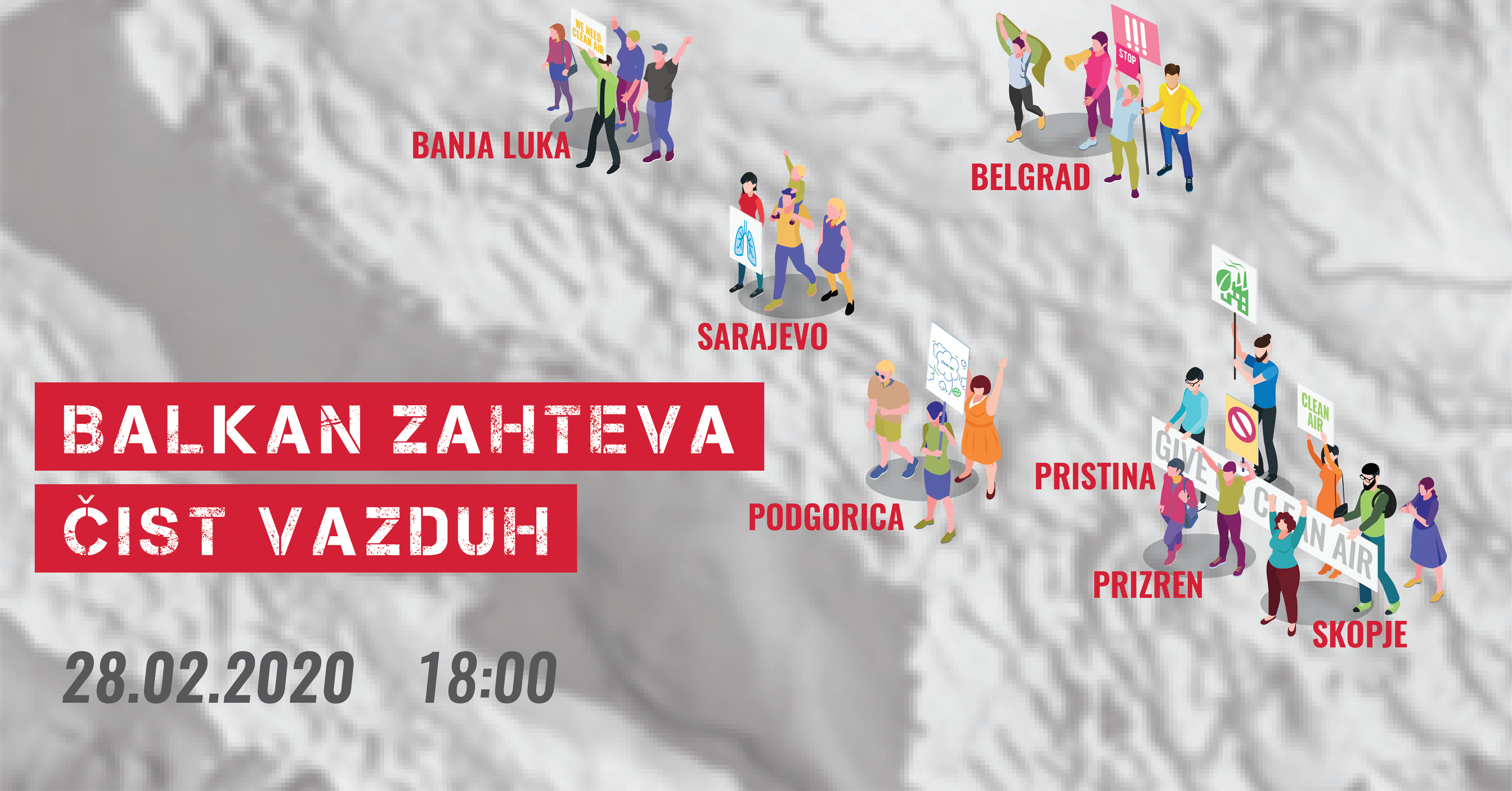 Ekološki građanski aktivisti i organizacije civilnog društva iz sedam gradova zemalja Zapadnog Balkana, Podgorice, Beograda, Sarajeva, Banja Luke, Prištine, Prizrena i Skoplja, u petak 28. februara, organizovaće sihronizovane ativnosti pod sloganon ,,BALKAN ZAHTIJEVA ČIST VAZDUH”, čime se želi uticati na rješavanje dugotrajnog i izraženog problema aerozagađenja, koji uzrokuje nesagledive posledice po javno zdravlje i životnu sredinu.