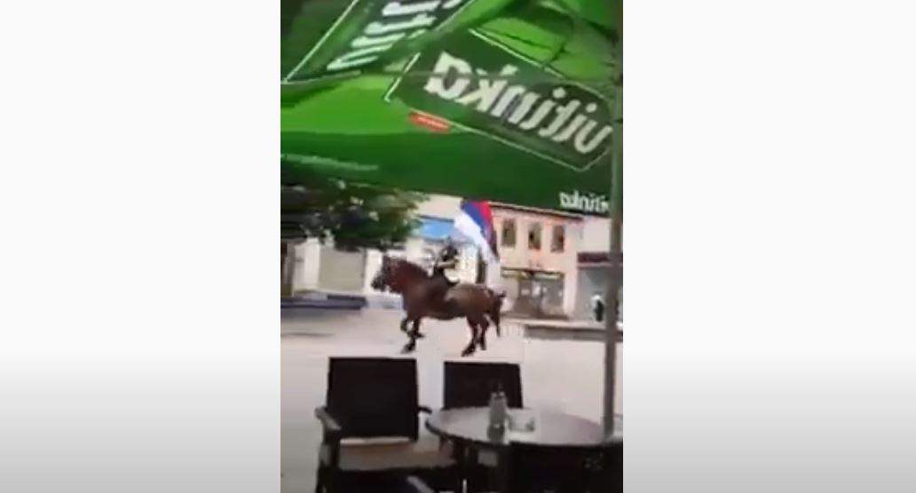 Jedan od vjernika SPC na moleban je došao na konju sa zastavom Srbije.