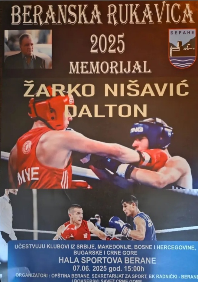 Međunarodni bokserski turnir “Beranska rukavica 2025 – Memorijal Žarko Nišavić – Dalton” biće održan u subotu, 7. juna, u Hali sportova, sa početkom u 15 časova.