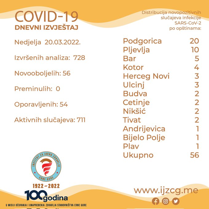 U Crnoj Gori registrovano je još 56 novooboljelih od koronavirusa u posljednja 24 sata. Od jučerašnjeg presjeka nije bilo smrtnih ishoda povezanih sa infekcijom covid 19, saopšteno je iz Instituta za javno zdravlje IJZ.