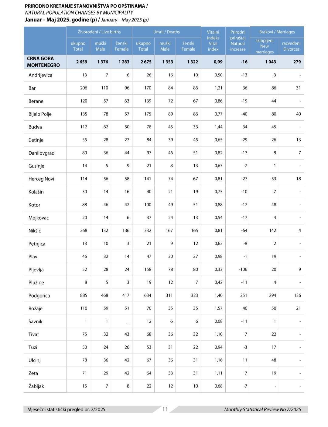 Prema najnovijim podacima Uprave za statistiku (Monstat), od 1. januara do 31. maja rođeno je 2.659 beba, dok je preminulo 2.675 osoba, što znači da je prirodni priraštaj negativan i iznosi -16.