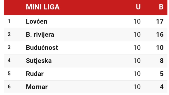 Naime, šest najboljih ekipa nastavlja nastup u mini-ligi za prvaka. Pritom, na vrhu je Lovćen, uz bod više od Budvanske rivijere.