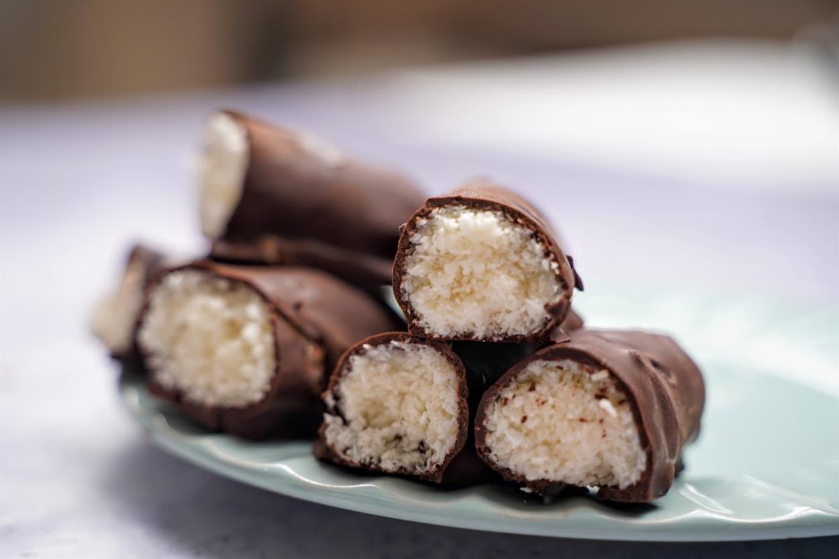 Smjesu rukama oblikujte u duguljaste oblike poput Bounty čokoladica (čvrsto stisnite kako bi se zadržao oblik). Nakon što ste oblikovali tri ili četiri komada, pokvasite ruke kako vam se smjesa ne bi lijepila.