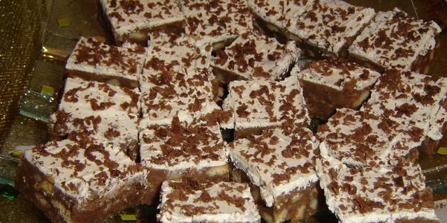 Kekse prepoloviti, a orahe nasjeckati pa sve skupa treba sjediniti i izliti u namašćen kalup.Kad se stvrdne i ohladi staviti šlag i posuti narendanom čokoladom.