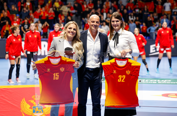 Uramljeni dres sa državnim grbom uoči početka meča uručio im je predsjednik Rukometnog saveza Crne Gore Petar Kapisoda