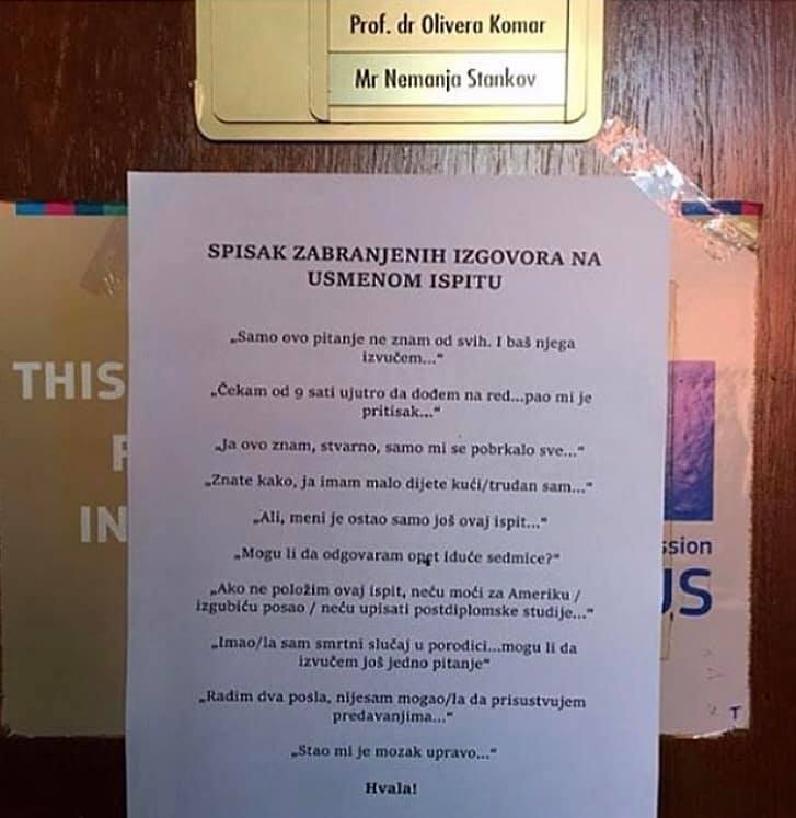 Profesorica na Fakultetu političkih nauka, Olivera Komar, jutros je, na ispitu iz predmeta Metodologija političkih nauka, studentima IV godine na vratima svog kabineta napisala spisak zabranjenih izgovora na usmenom ispitu.