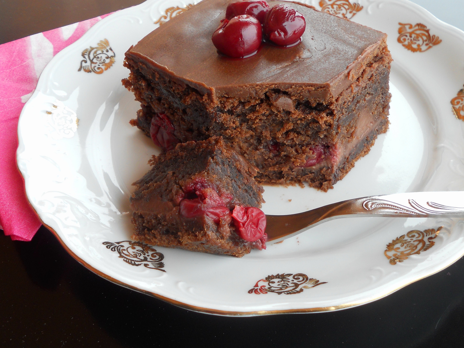 Sam kolač da je ostao čokoladan bio bi suviše jak, mada može i tako da se napravi, za sve ljubitelje jakog ukusa, ali ovim dodavanjem želea od višanja dobijamo odličnu kombinaciju koja osvježava kisjelkastim ukusom gorčinu i težinu čokoladnog ukusa.