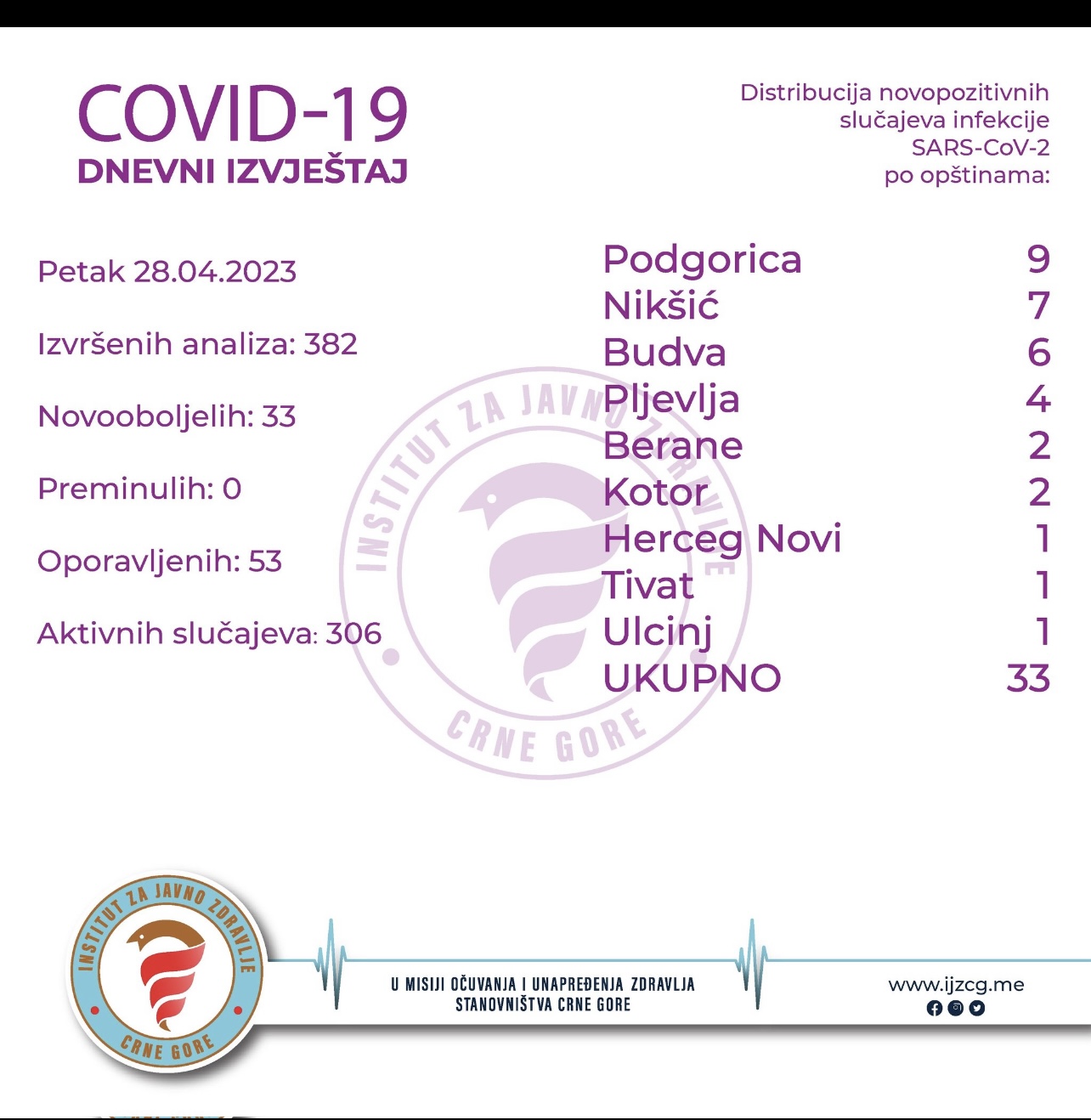 Izvršene su 382 analize, od čega je 33 novooboljelih i to iz: