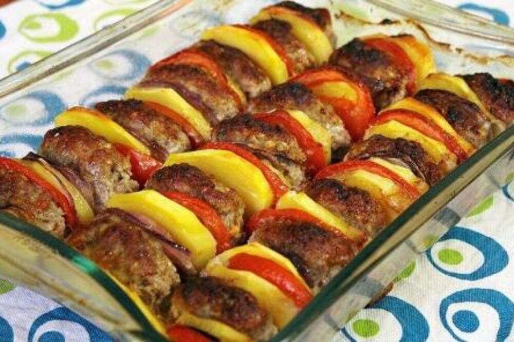 Mesu dodati sitno isjeckan crni i bijeli luk, biber, suvi začin i peršun pa sve rukom umijesiti. Ostaviti da odstoji dok pripremite ostale sastojke. Krompir očistiti i isječi na kolutove, isto i sa ljubičastim lukom i paradajzom.