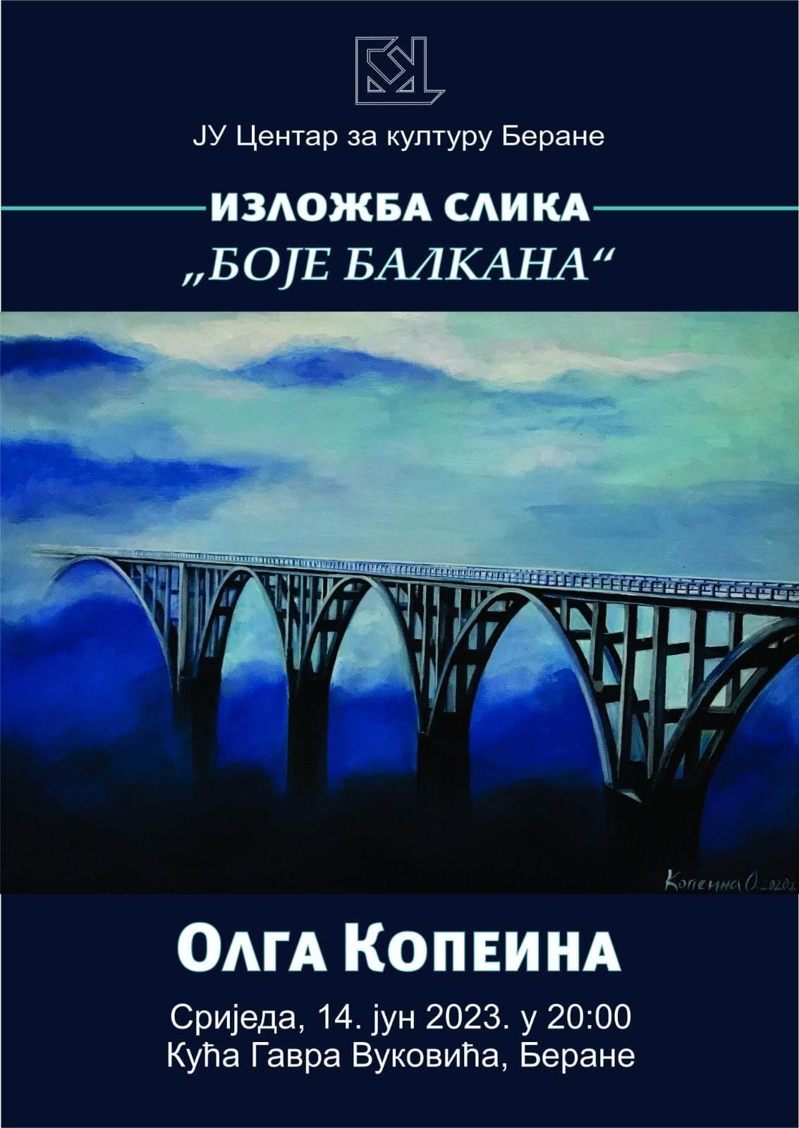 U organizaciji JU Centar za kulturu Berane, u Spomen kući vojvode Gavra Vukovića u srijedu, 14. juna 2023. godine u 20 časova, biće upriličena izložba slika ruske umjetnice Olge Kopeine, pod nazivom „Boje Balkana“.