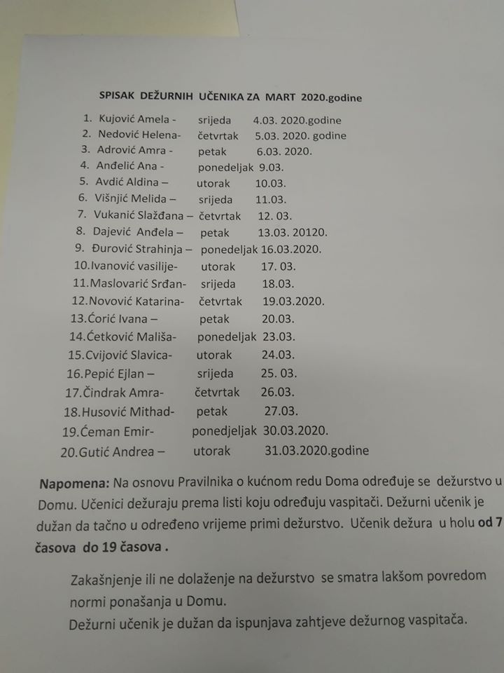 Kašnjenje ili ne dolaženje na dežurstvo se smatra lakšom povredom normi ponašanja u Domu učenika.