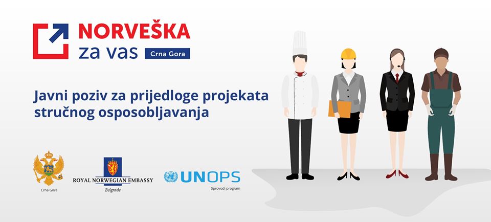 Javni poziv za organizovanje stručnih obuka za nezaposlene u manje razvijenim opštinama Crne Gore, otvoren je do četvrtka, 30. januara 2020. godine. Za bespovratna sredstva Kraljevine Norveške u ukupnom iznosu od 150.000 evra, izdvojenih preko projekta „Norveška za vas – Crna Gora“, mogu da konkurišu privatne firme, lokalne samouprave ili javna preduzeća, licencirani organizatori obrazovanja odraslih, nevladine organizacije i drugi entiteti za sprovođenje programa obuke za nezaposlene.