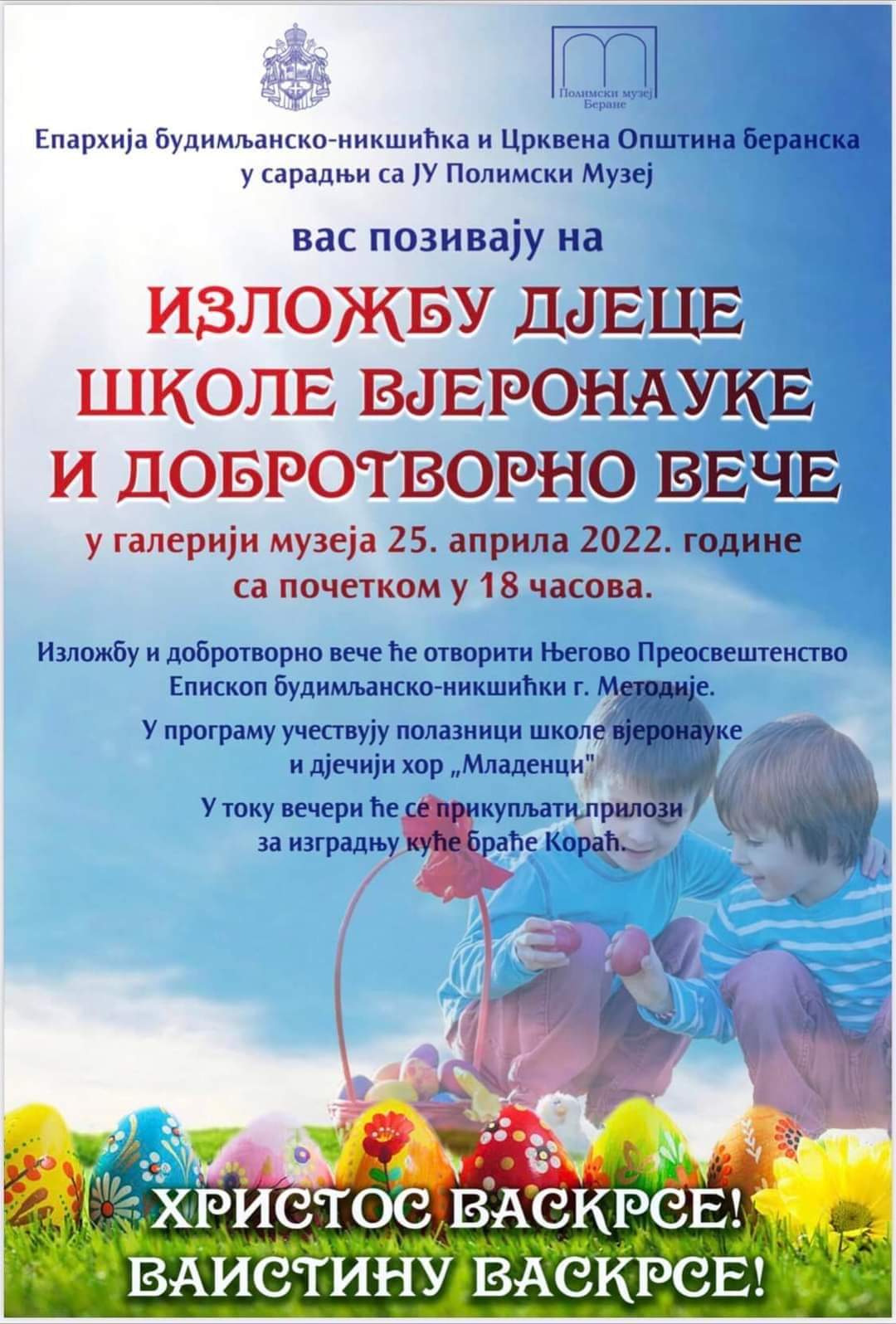 U saradnji Eparhije budimljansko-nikšićke i Crkvene opštine Berane sa upravom JU Polimski muzej rodila se ideja da se organizuje izložba radova učenika škole vjeronauke na temu „Vaskrs i zajednica“, koji će se održati u Muzejskoj galeriji na Uskršnji ponedjeljak, 25. aprila s početkom u 18 sati. Istom prilikom prikupljaće se donacije za izgradnju kuće za porodicu Korać koja odrasta bez roditelja.