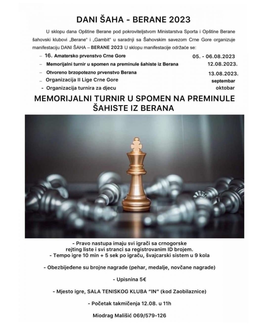 Manifestaciju “Dani šaha – Berane 2023” pod pokroviteljstvom Ministarstva sporta i Opštine Berane organizuju šahovski klubovi “Berane” i “Gambit” u saradnji sa Šahovskim savezom Crne Gore.