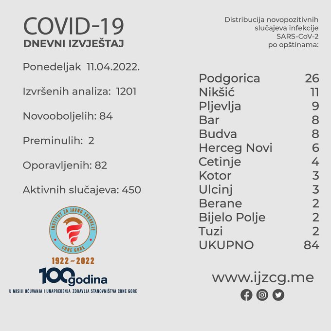 U posljednja 24 sata u Crnoj Gori su registrovana još 84 slučaja korona virusa, a preminule su dvije osobe, saopšteno je iz Instituta za javno zdravlje.
