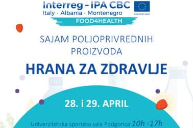 Ministarstvo poljoprivrede, šumarstva I vodoprivrede Vas poziva da prisustvujete na dvodnevnom sajmu „Hrana za Zdravlje“, u sklopu projekta „Održivi i inovativni lanac vrijednosti Agro hrane i ribarstva za prekogranično tržište mikro, malih i srednjih preduzeća“ (FOOD4HEALTH) u okviru programa „INTERREG IPA CBC programa Italija-Albanija-Crna Gora 2014/2020“, finansiranog od strane Evropske unije u okviru Instrumenta za Pretpristupnu pomoć (IPA II).