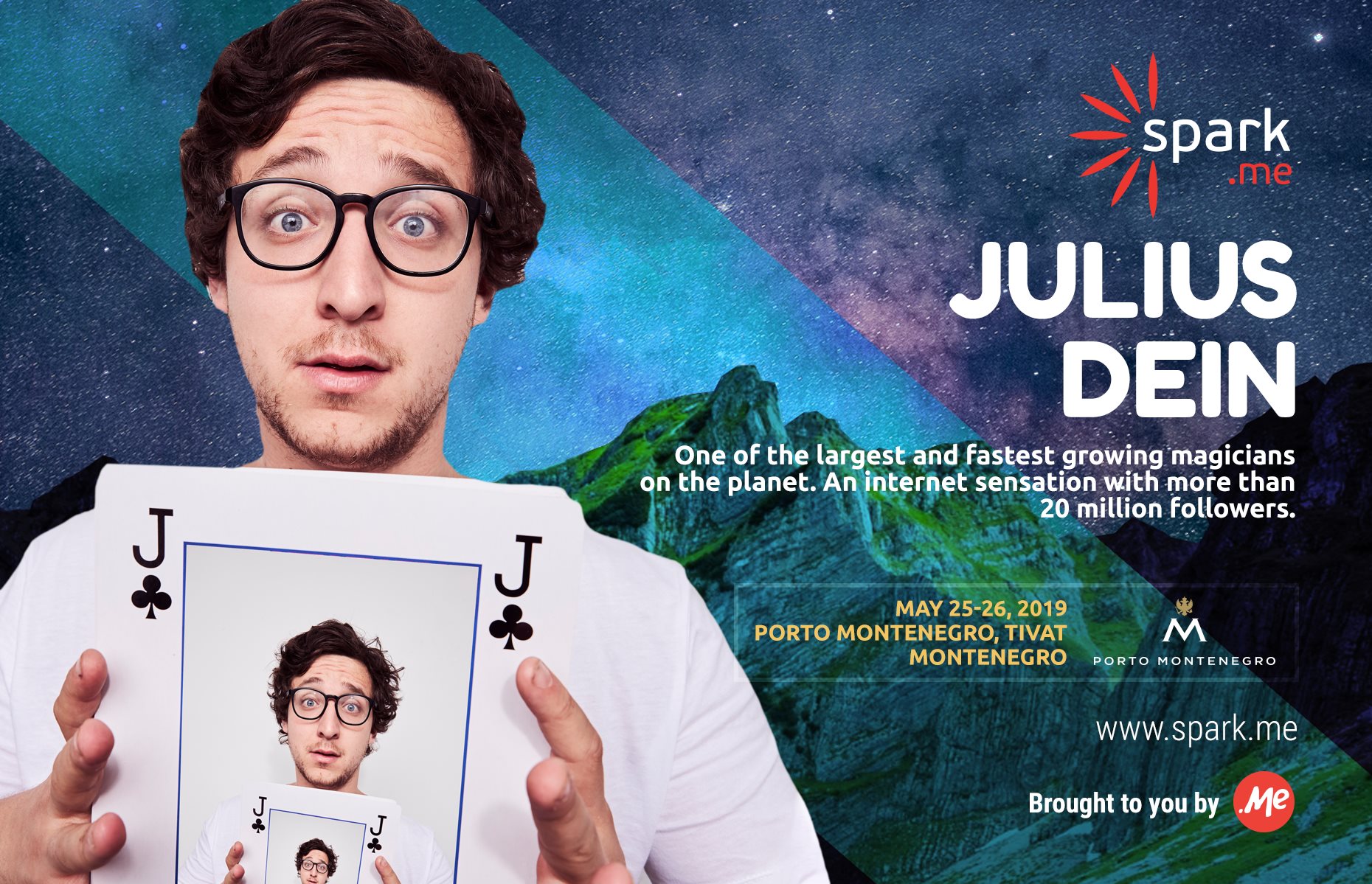 Organizacioni tim Spark.me, jedne od najvećih marketinških konferencija u Jugoistočnoj Evropi, koja je zakazana za 25. i 26. maj a koja se organizuje pod generalnim sponzorstvom kompanije m:tel i to po prvi put u Auditorijumu Porto Montenegra u Tivtu, je objavio ime novog govornika konferencije Spark.me 2019 – Džulijus Din (Julius Dein), jedan od najpopularnijih mađioničara na svijetu koji je za samo tri godine uspio da izgradi online publiku od preko 20 miliona pratilaca.