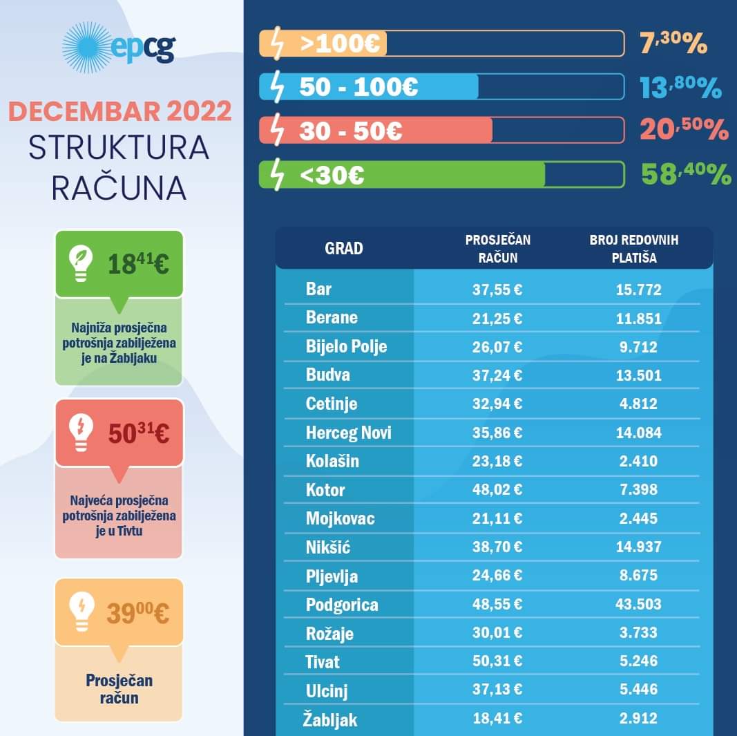 Prosječan decembarski račun za električnu energiju za domaćinstva na nivou Crne Gore (ukoliko se izuzmu neočitana mjerna mjesta u objektima koji nijesu stalno nastanjeni) iznosi 39,00 eura. Domaćinstva na Žabljaku bilježe najnižu prosječnu potrošnju od 18,41 eura, dok je najveća prosječna potrošnja prethodnog mjeseca očitana u Tivtu gdje su domaćinstva u prosjeku potrošila električne energije u vrijednosti od 50,31 eura.
