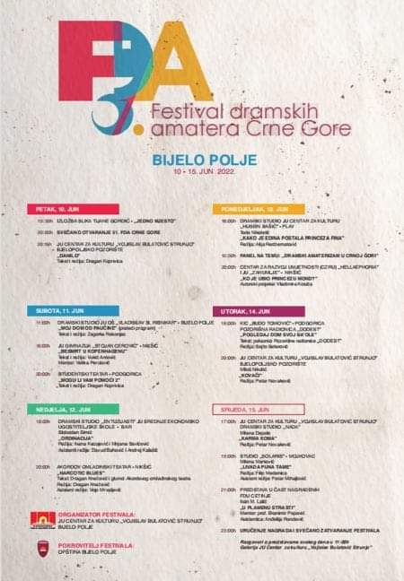 Kako se navodi u saopštenju, ovogodišnji Savjet Festivala donio je odluku da u zvaničnom takmičarskom dijelu bude izvedeno jedanaest predstava crnogorske amaterske produkcije iz šest gradova: Bara, Podgorice, Nikšića, Plava, Mojkovca i Bijelog Polja.