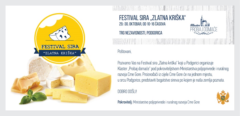 Klaster „Probaj domaće” organizuje 29. i 30. oktobr, na Trgu nezavisnosti u Podgorici, Festival sira „Zlatna kriška“.