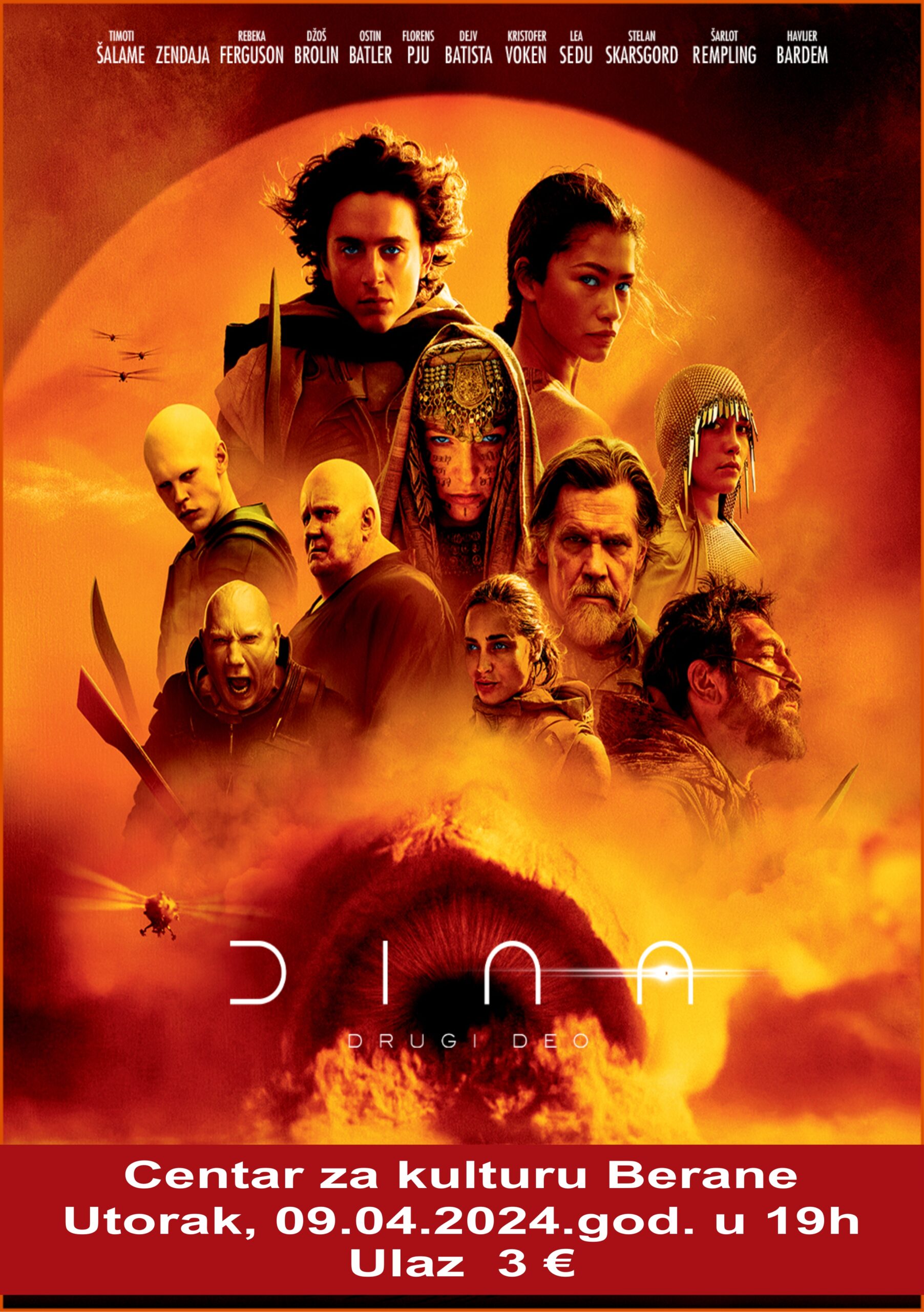 Film “Dina 2” će biti prikazan u bioskopu Centra za kulturu u utorak, 9. aprila 2024. godine u 19 časova.