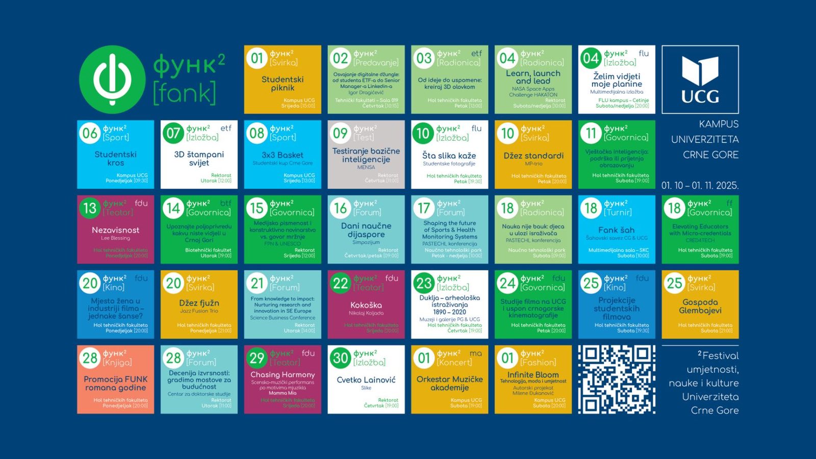 Drugo izdanje Festivala umjetnosti, nauke i kulture – FUNK 2025, u organizaciji Univerziteta Crne Gore, biće održano od 1. oktobra do 1. novembra i donosi 30 programa u devet festivalskih cjelina: Govornica, Forum, Kino, Teatar, Izložba, Knjiga, Radionice, Sport i Svirke. Festival je najavljen na konferenciji za medije danas u Rektoratu UCG.