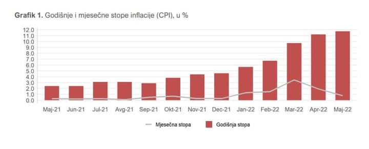 Potrošačke cijene u maju su, u odnosu na isti mjesec prošle godine, u prosjeku bile više 11,7 odsto.