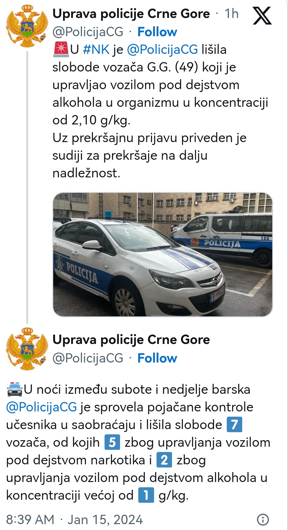 Nikšićka policija uhapsila je G.G. (49) koji je upravljao vozilom pod dejstvom alkohola u organizmu u koncentraciji od 2,10 g/kg.