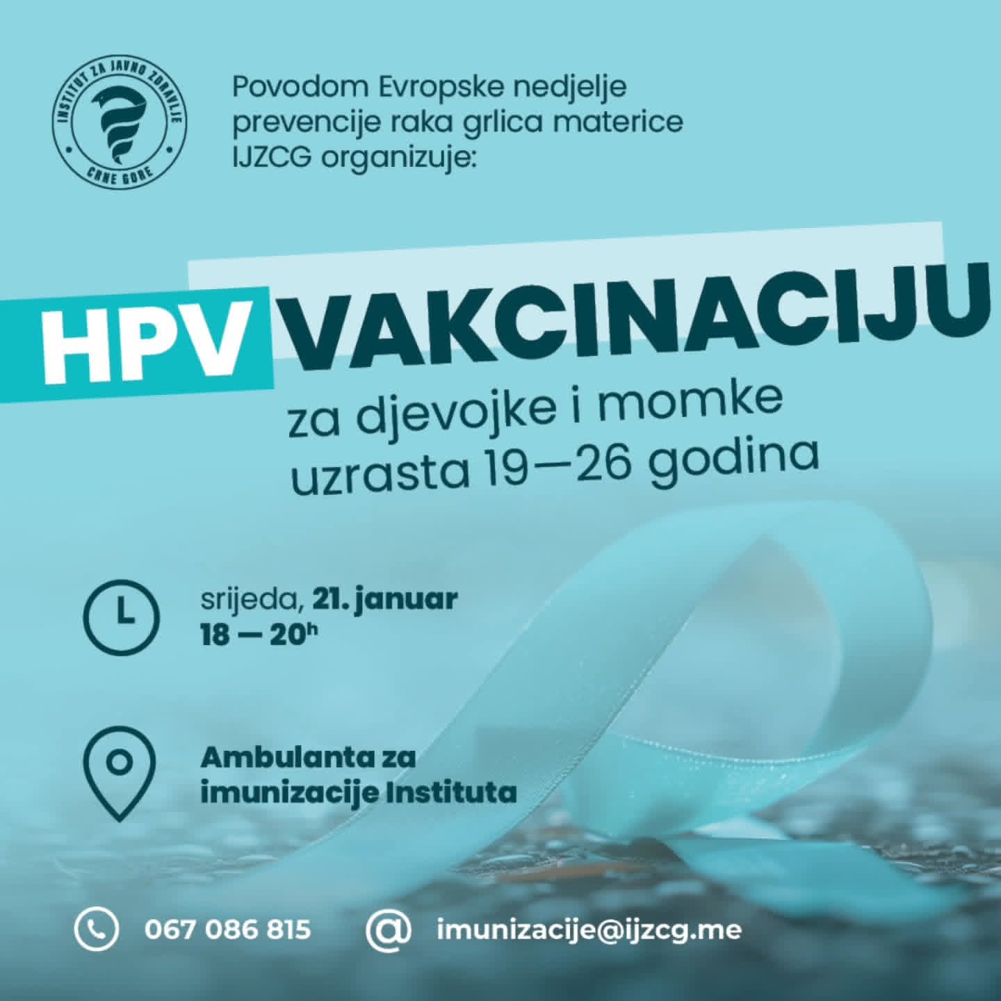 Povodom Evropske nedjelje prevencije raka grlića materice, Institut za javno zdravlje Crne Gore (IJZCG) organizuje HPV vakcinaciju namijenjenu djevojkama i momcima uzrasta od 19 do 26 godina.