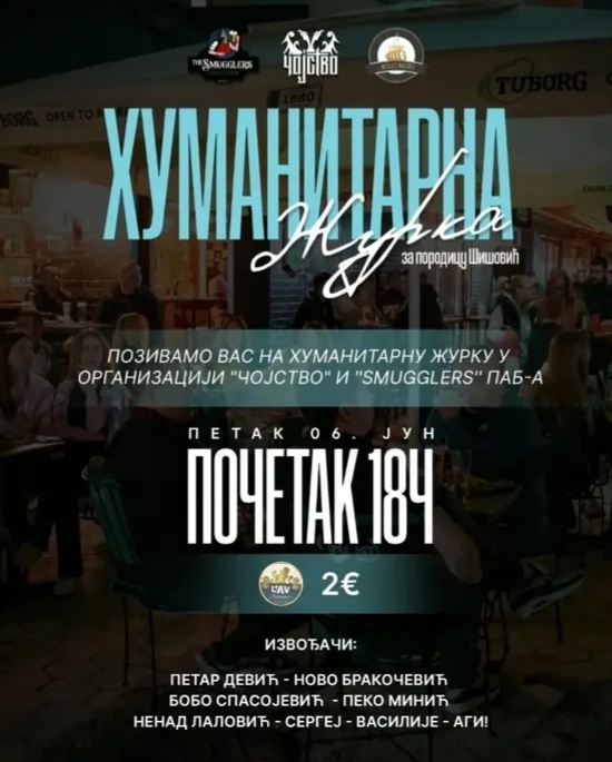 Humanitarna žurka za pomoć porodici Šišović biće održana u petak, 6. juna, u Smugglers Pub-u u Beranama sa početkom u 18 časova.