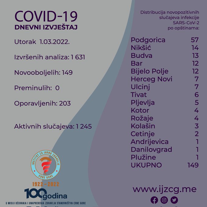 Institut za javno zdravlje Crne Gore izvršio je analizu 1631 uzoraka među kojima je utvrđeno 149 novopozitivnih slučajeva na Covid-19, a prijavljeno je 203 oporavljenih. Post navigation Održana radionica u Srednjoj medicinskoj školi Sjutra konferencija za medije povodom trenutne epidemiološke situacije