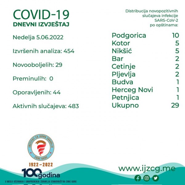 U Crnoj Gori je, u posljednja 24 sata, registrovano 29 novih slučajeva infekcije koronavirusom.