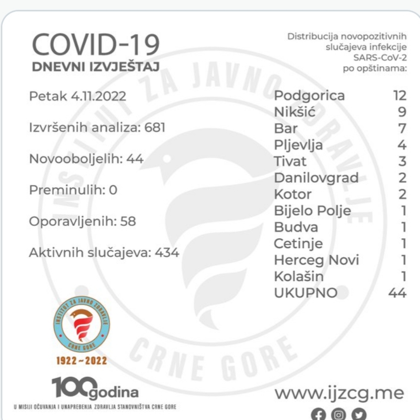 U posljednja 24 sata registrovana su 44 nova slučaja koronavirusa, na 681 analiziran uzorka, objavio je Institut za javno zdravlje Crne Gore na Tviteru.