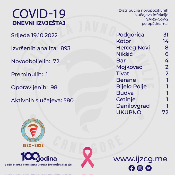 Oporavilo se još 98 osoba, pa je trenutno aktivno 580 slučajeva infekcije, naveli su iz Instituta za javno zdravlje Crne Gore (IJZCG).