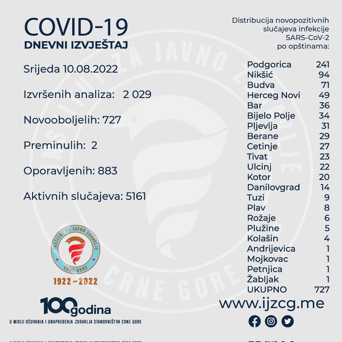 Laboratorije Instituta za javno zdravlje Crne Gore (IJZCG), druge javne i privatne laboratorije koje se bave dijagnostikom infekcije novog koronavirusa su tokom jučerašnjeg dana (srijeda, 10.08.2022. godine) završile analizu i IJZCG dostavile rezultate za 2 029 uzoraka na novi koronavirus.