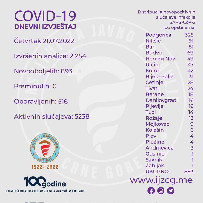 U Crnoj Gori su, u posljednja 24 sata, registrovana 893 slučaja infekcije korona virusom, a nije registrovan nijedan smrtni slučaj, saopštili su iz Instituta za javno zdravlje (IJZ).