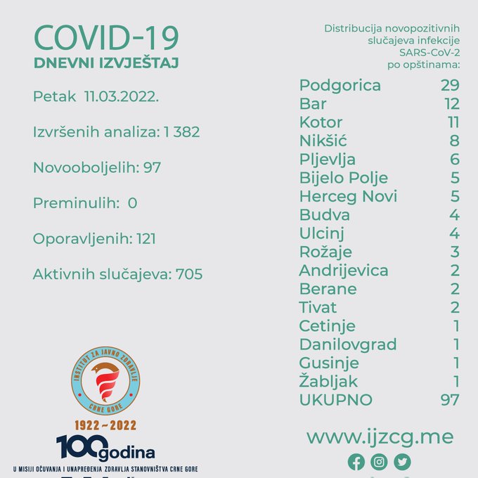 U posljednja 24 sata nije bilo smrtnih ishoda povezanih sa koronavirusom. Registrovano je 97 novih slučajeva, a oporavila se 121 osoba, saopšteno je iz Instituta za javno zdravlje.