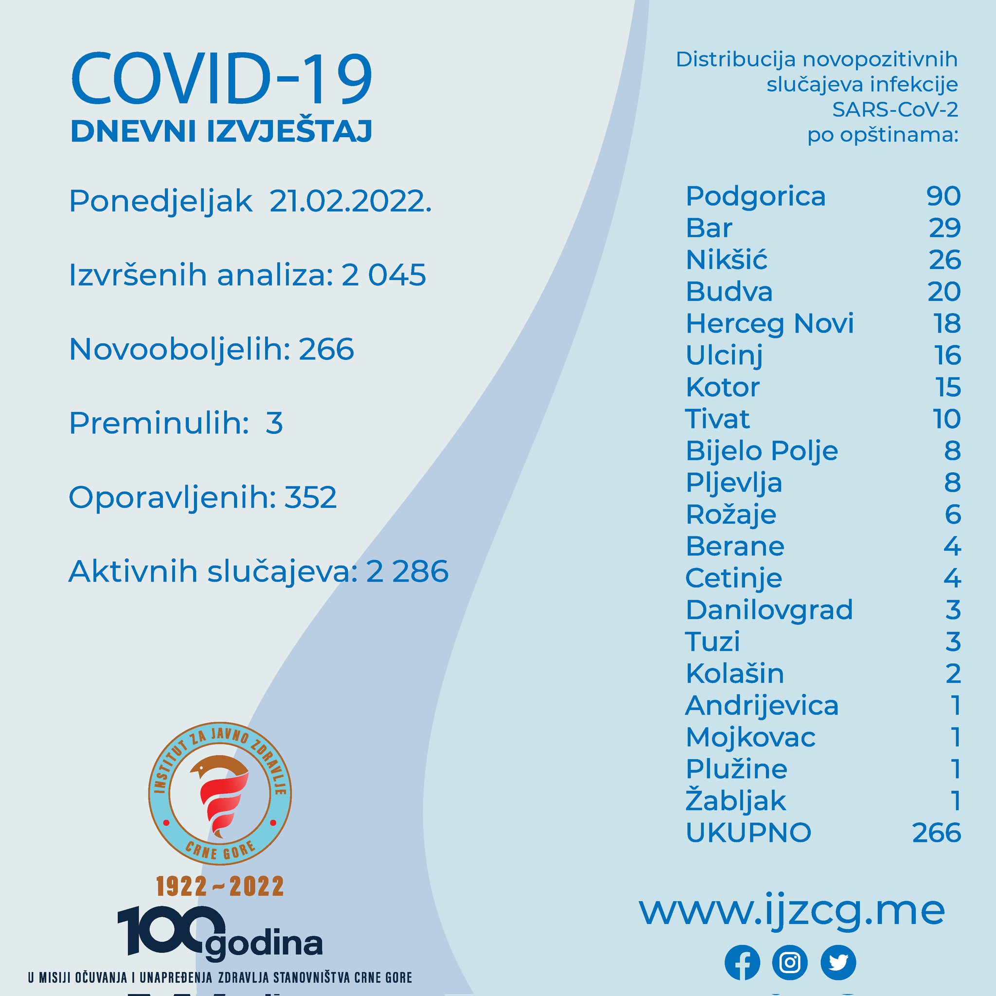 U posljednja 24 sata u Crnoj Gori su od posljedica koronavirusa preminule tri osobe, a registrovano je 266 novooboljelih, pokazuju trenutni podaci objavljeni na sajtu Instituta za javno zdravlje.