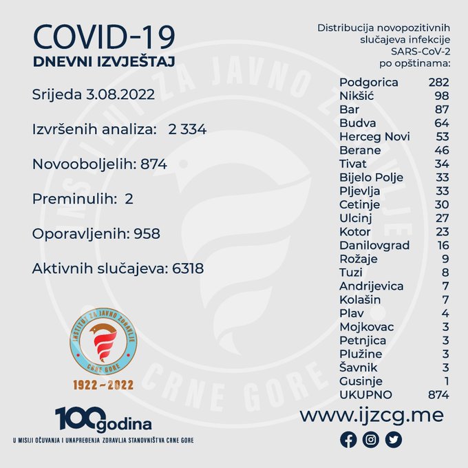 Laboratorije Instituta za javno zdravlje Crne Gore (IJZCG), druge javne i privatne laboratorije koje se bave dijagnostikom infekcije novog koronavirusa su tokom jučerašnjeg dana (srijeda, 03.08.2022. godine) završile analizu i IJZCG dostavile rezultate za 2 334 uzoraka na novi koronavirus.