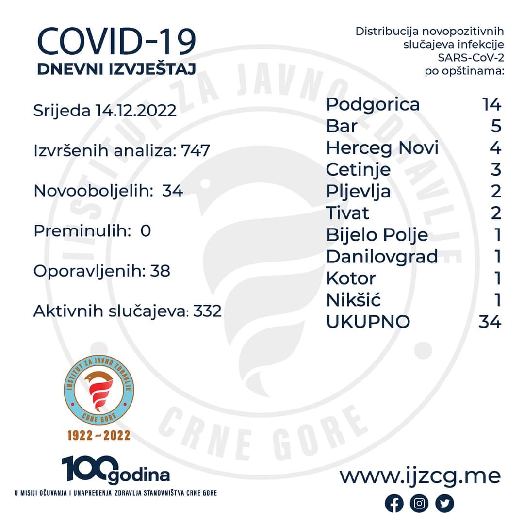 Iz Instituta za javno zdravlje saopšteno je da je u posljednja 24 sata registrovano 34 nova slučaja koronavirusa. Od posledica infekcije nije bilo preminulih.