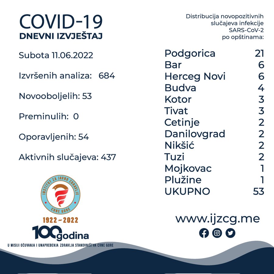 Kako je objavljeno na Twitter nalogu IJZ-a, prijavljen je oporavak 54 pacijenta, a broj aktivnih slučajeva u Crnoj Gori je 437.