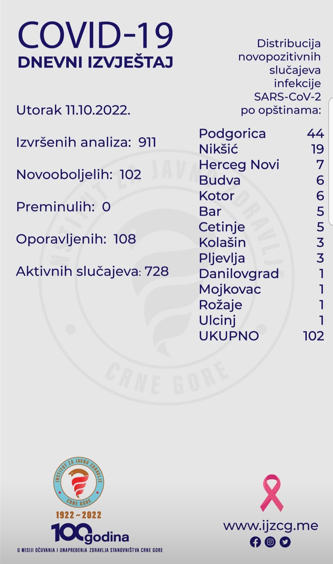 Iz Instituta za javno zdravlje saopšteno je da su u posljednja 24 sata registrovana 102 nova slučaja koronavirusa, te da nije bilo smrtnih ishoda povezanih sa koronavirusom.