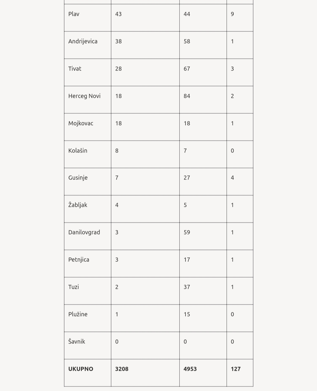 Uzimajući u obzir sve novootkrivene slučajeve, ukupan broj trenutno aktivnih slučajeva COVID19 u Crnoj Gori trenutno iznosi 3208