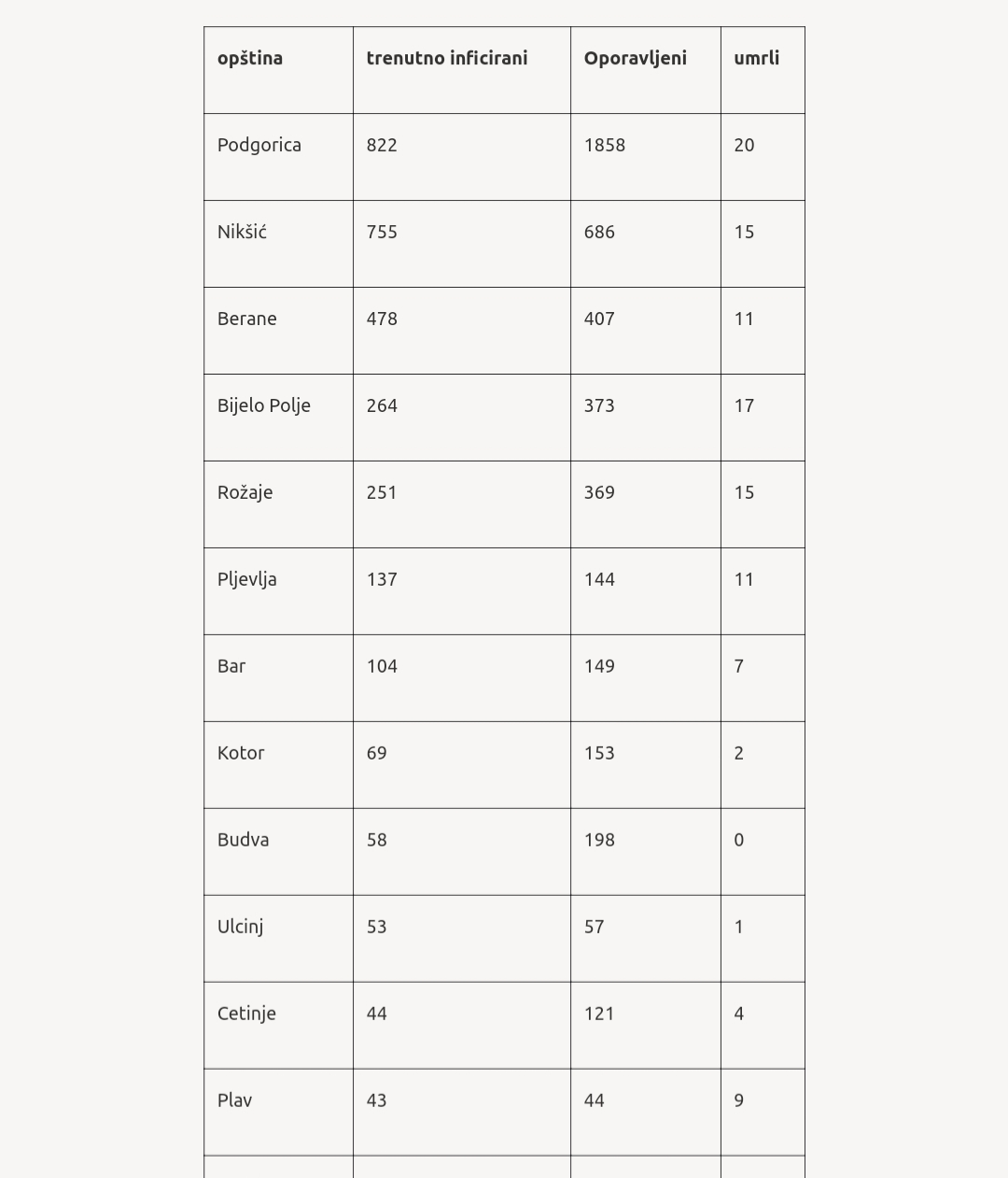 Od poslednjeg presjeka prijavljena su dva smrtna ishoda kod COVID19 pozitivnih pacijenata iz Rožaja i Plava, rođenih 1939 i 1940 godine a koji su liječeni u OB Berane. Ukupan broj smrtnih slučajeva povezanih sa COVID-19 infekcijom od početka juna mjeseca iznosi 127 a od početka godine 136.